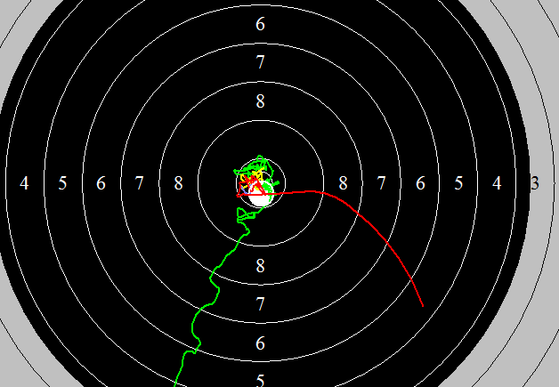 The green trace shows where the barrel is pointing during the development of the shot. The yellow trace is the last second before the shot is released. The blue trace is the last third of a second before the shot is released. The yellow cross noted above is also there but difficult to see in this image. The red trace is the follow through after the shot is released.